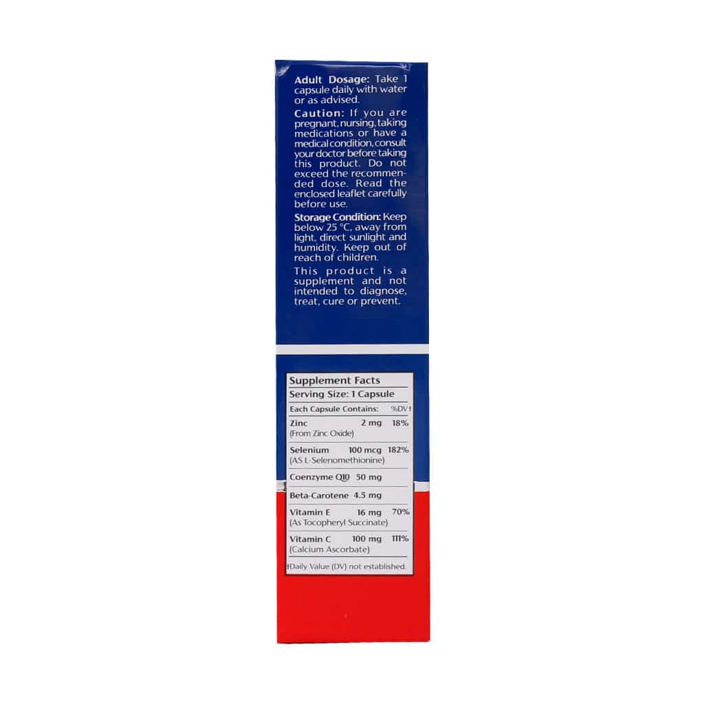 هر کپسول حاوی 2 میلی گرم زینک، 100 میکروگرم سلنیوم، 50 میلی گرم کوآنزیم کیوتن، 4.5 میلی گرم بتاکاروتن، 16 میلی گرم ویتامین E و 100 میلی گرم ویتامین C می باشد.